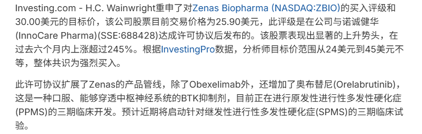 Zenas潜力获资本市场认可,华尔街分析师普遍给出“Strong Buy”评级。Zenas在多发性硬化等自免领域临床经验丰富,是推进奥布替尼临床的合适选择。