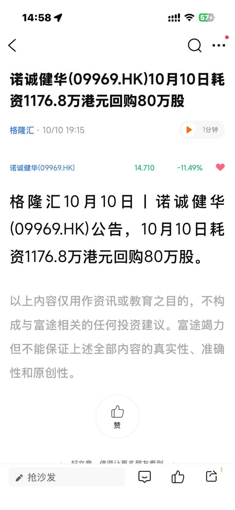 $诺诚健华(HK|09969)$ 资金不懂这个BD合作的好处,那公司自己回购股份!反正公司现金多!