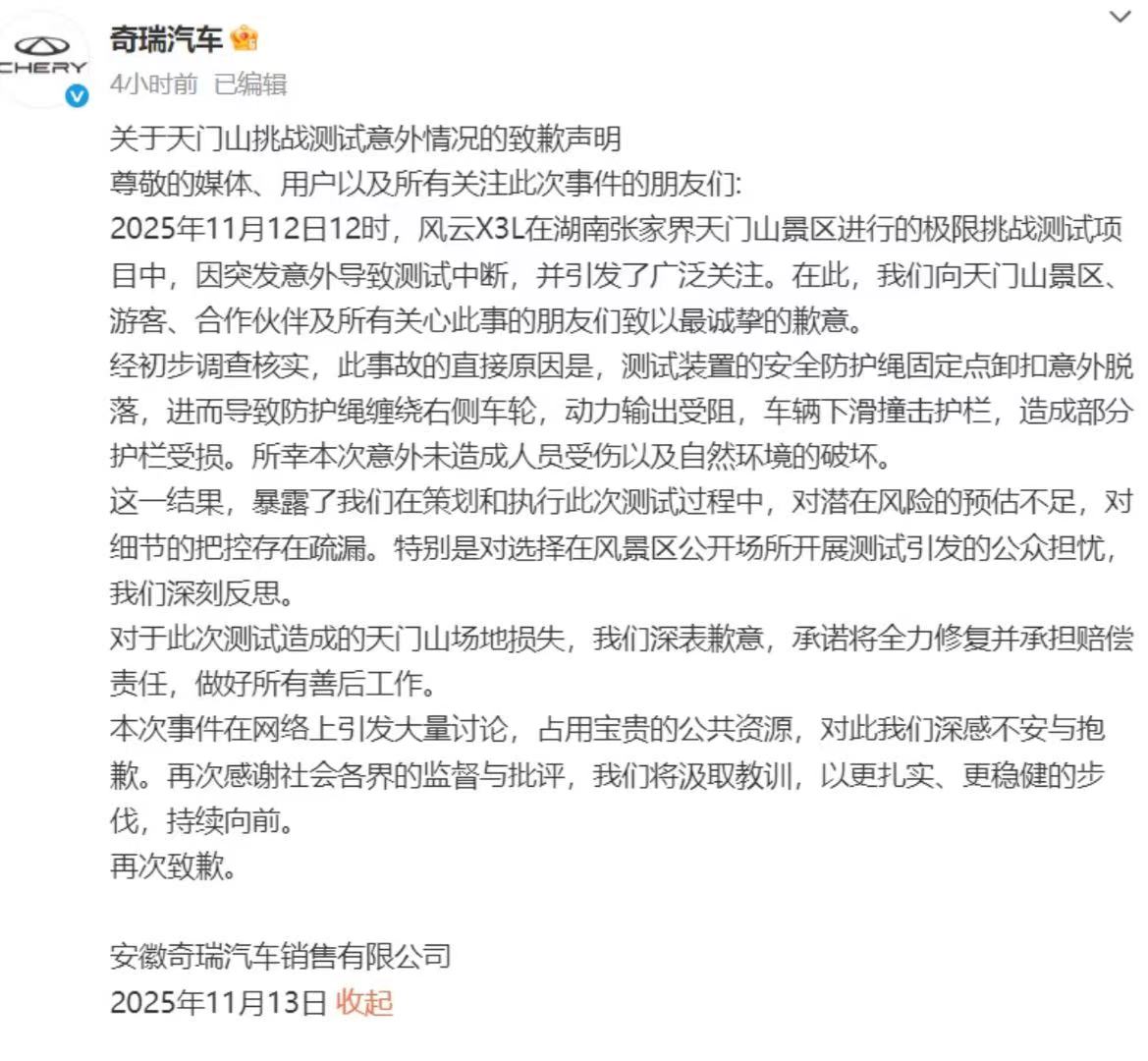11月13日凌晨,安徽奇瑞汽车销售有限公司就湖南张家界天门山挑战测试意外情况发布致歉声明。
