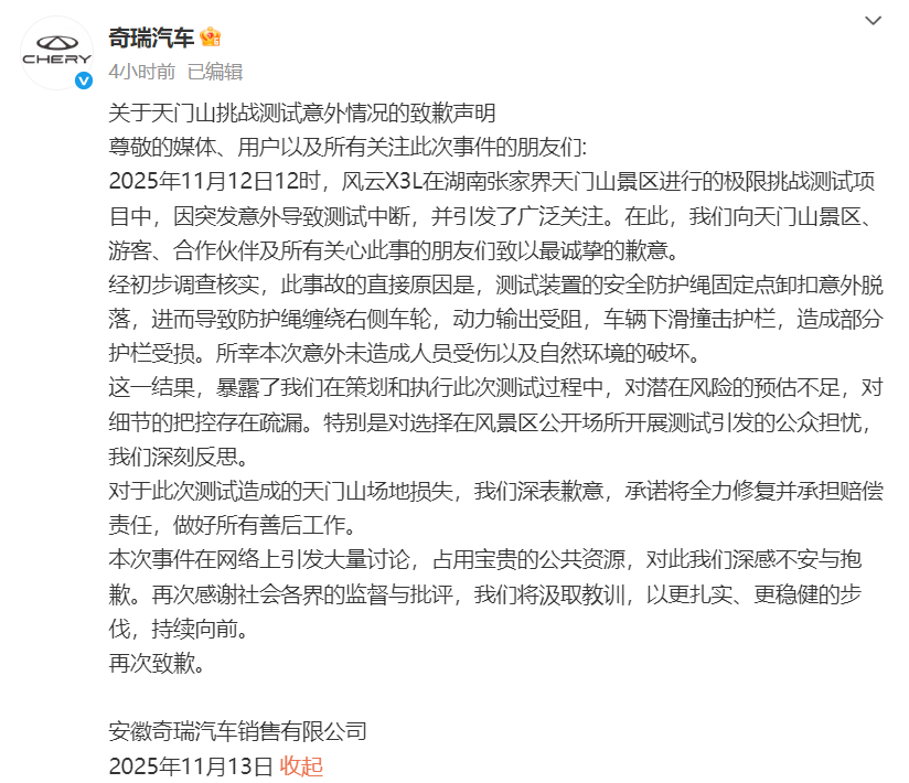 据奇瑞汽车官博消息,安徽奇瑞汽车销售有限公司11月13日发布《关于天门山挑战测试意外情况的致歉声明》: