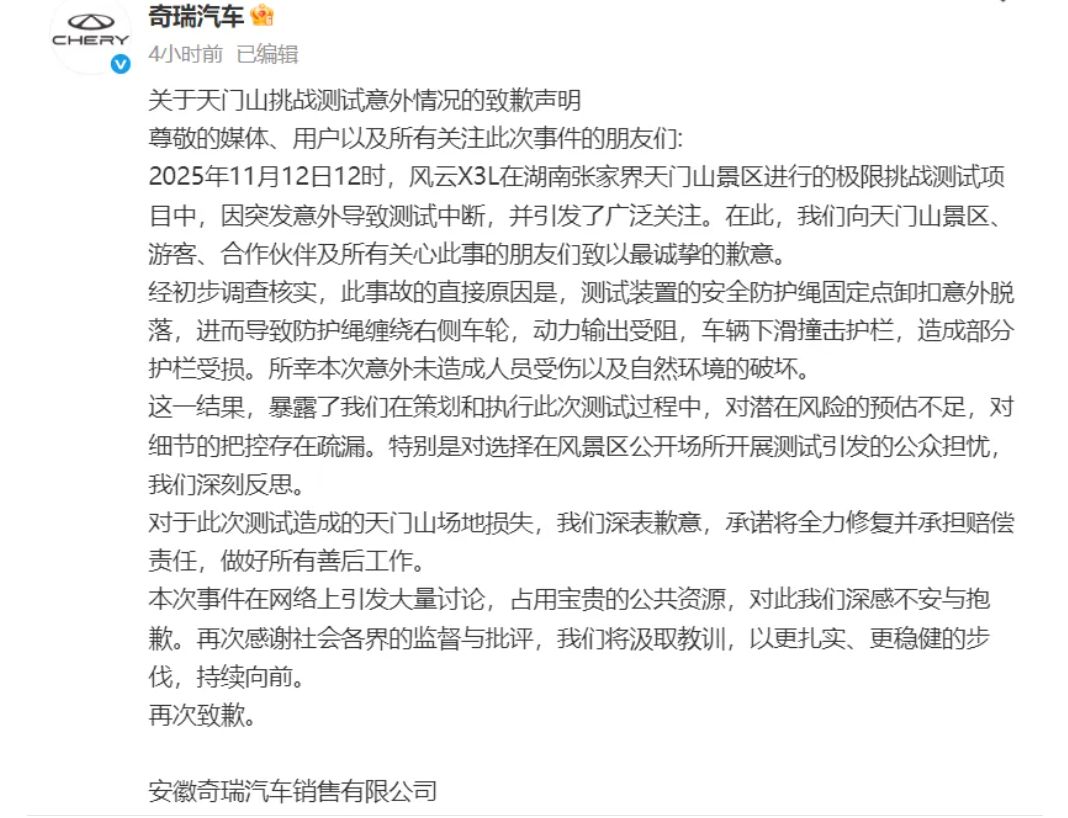 13日凌晨,安徽奇瑞汽车销售有限公司发布天门山挑战测试意外情况的致歉声明。