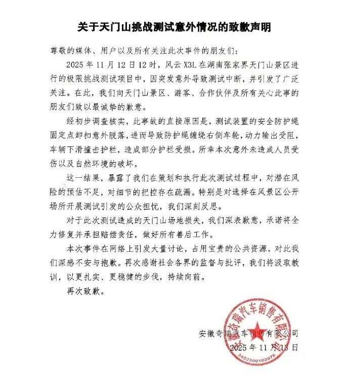 11月13日凌晨,安徽奇瑞汽车销售有限公司发表关于天门山挑战测试意外情况的致歉声明。