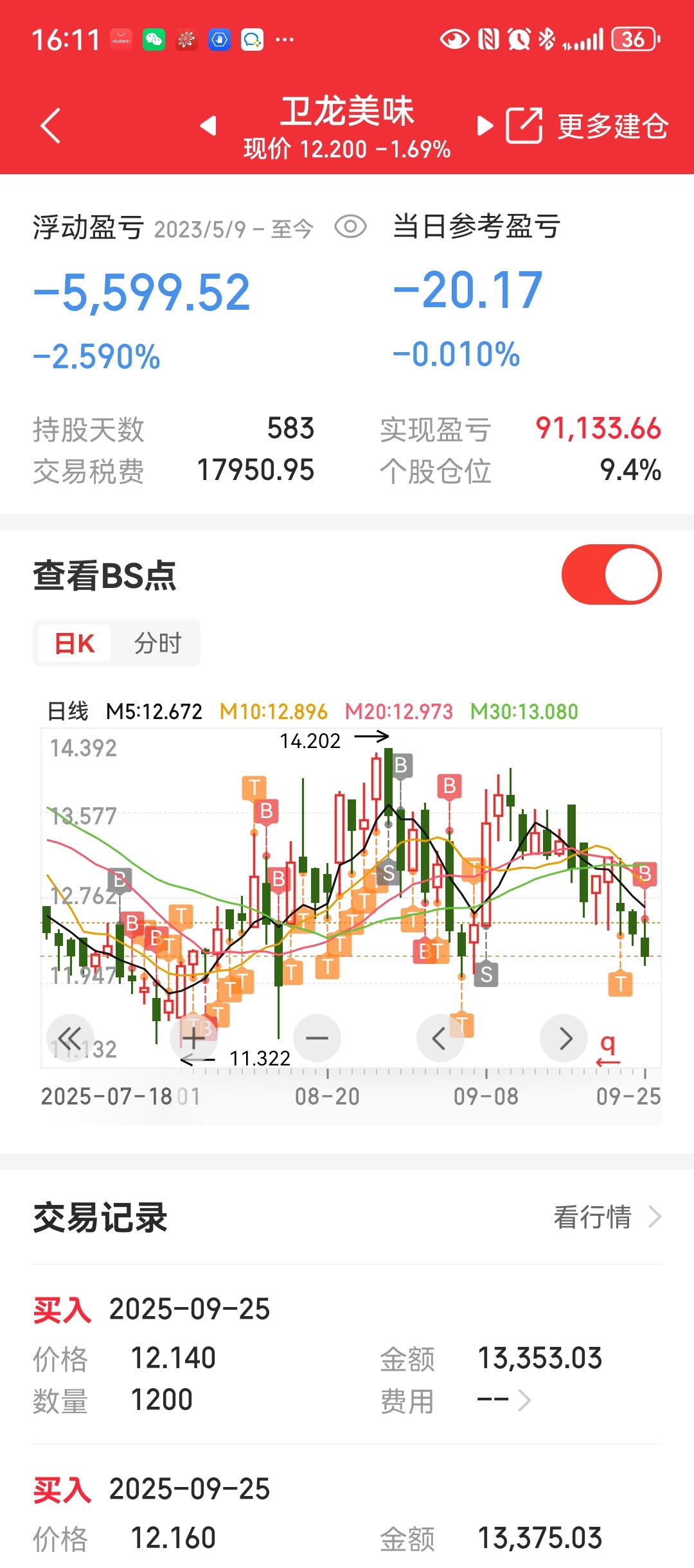 $卫龙美味(HK|09985)$ 再次触及12.2建仓点,毫不犹豫进场。只加不减,国庆节期间强烈看涨。14再出。上次盈利9.1万,这次继续加油!!