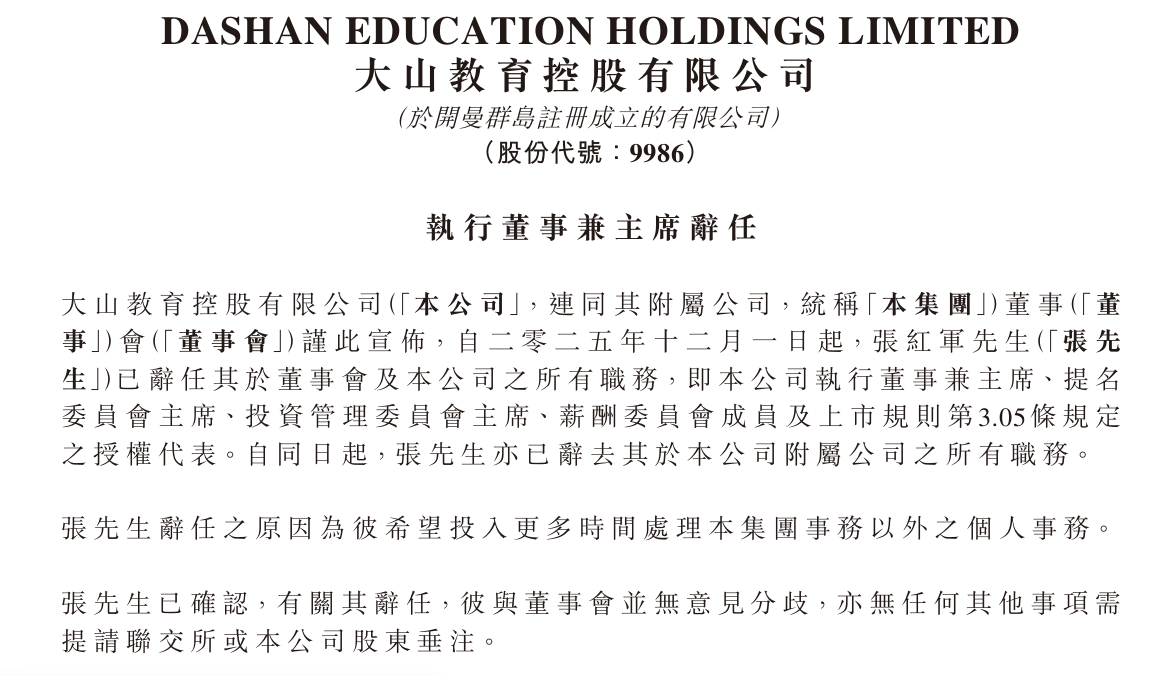 值得一提的是,12月3日晚间,大山教育公告称,自2025年12月1日起,张红军已辞任其于董事会及本公司之所有职务,即本公司执行董事兼主席、提名委员会主席、投资管理委员会主席、薪酬委员会成员及上市规则第3.05条规定之授权代表。自同日起,张先生亦已辞去其于本公司附属公司之所有职务。