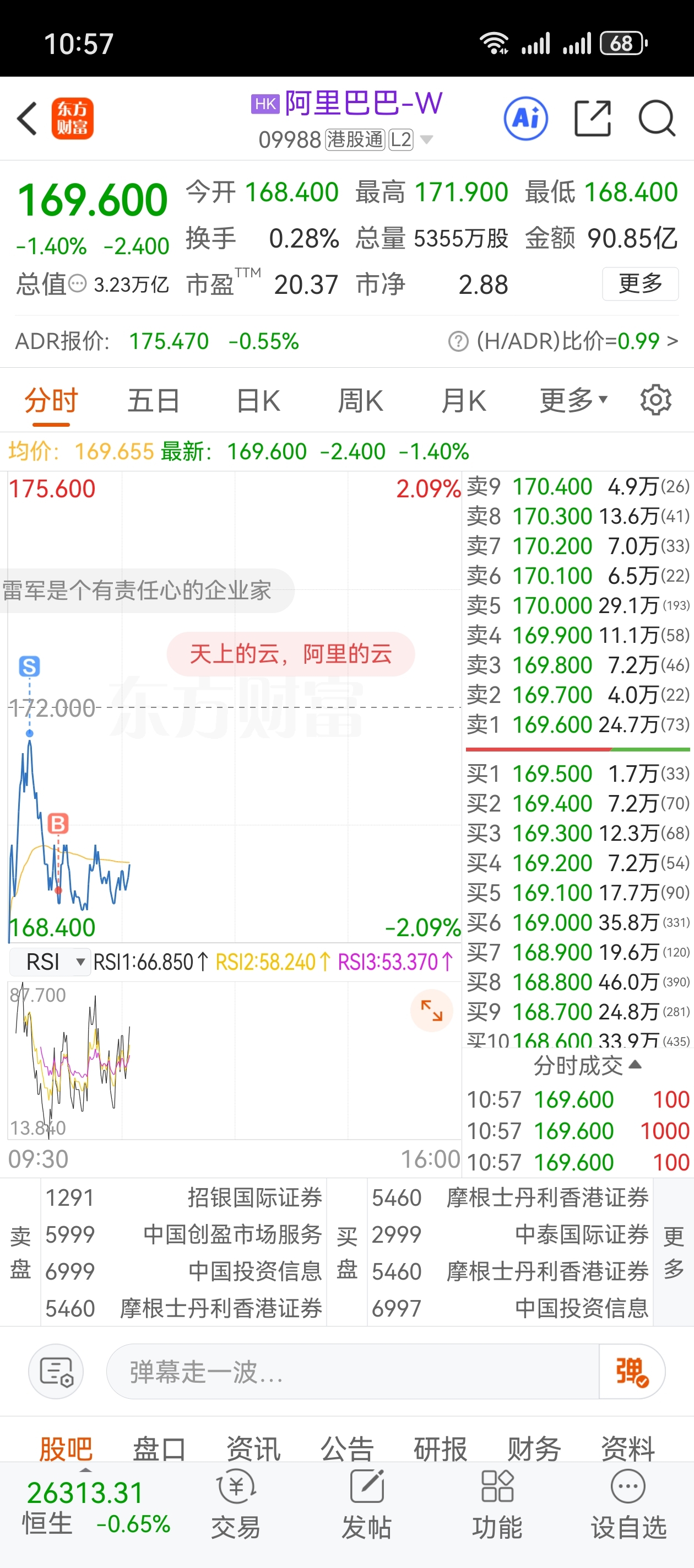 $阿里巴巴-W(HK|09988)$ 1000股做T,171.6卖 ,169.2接回。扣掉税小赚2千