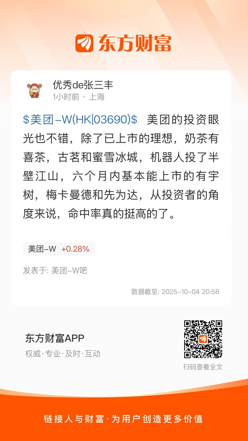 $美团-W(HK|03690)$ 美团的投资眼光也不错,除了已上市的理想,奶茶有喜茶,古茗和蜜雪冰城,机器人投了半壁江山,六个月内基本能上市的有宇树,梅卡曼德和先为达,从投资者的角度来说,命中率真的挺高的了。