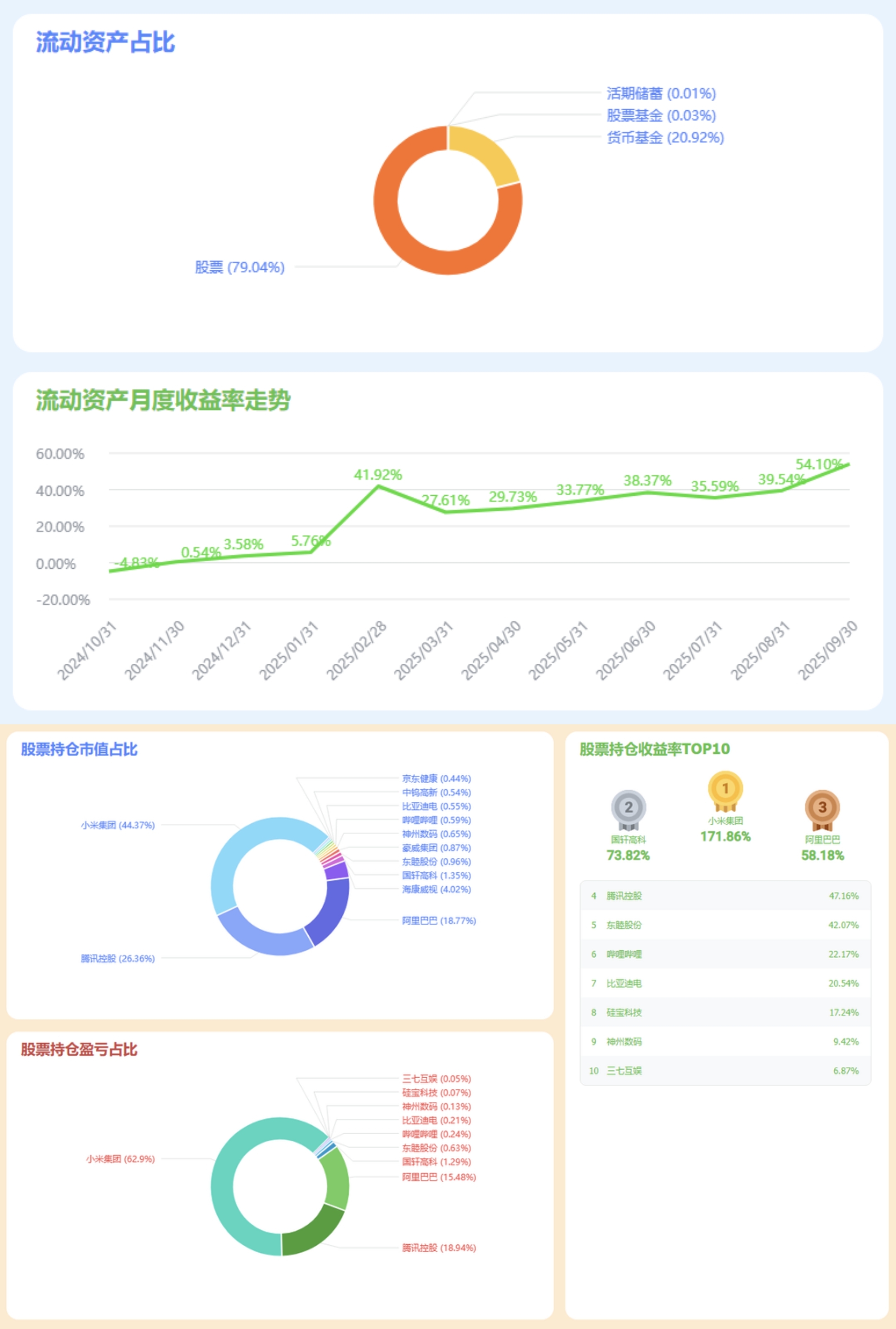 小米市值占比 44.37%,小米盈亏占比 62.90%,小米收益率 171.86%。