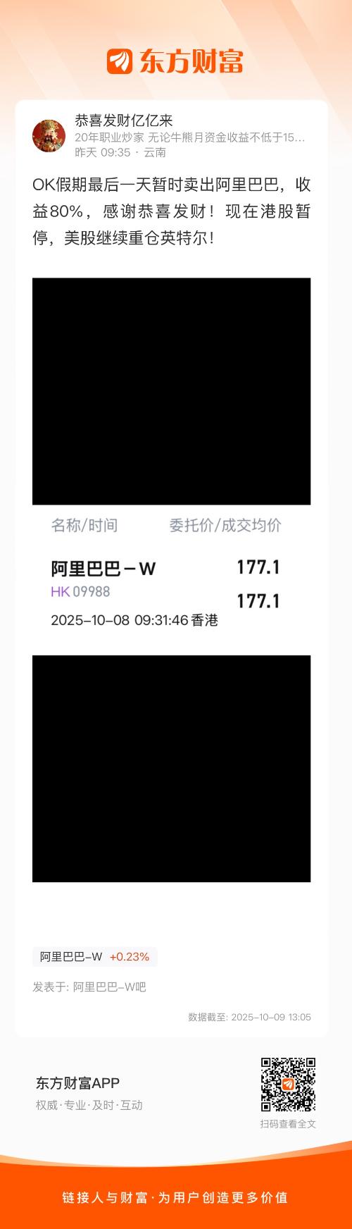 OK假期最后一天暂时卖出阿里巴巴,收益80%,感谢恭喜发财!现在港股暂停,美股继续重仓英特尔!