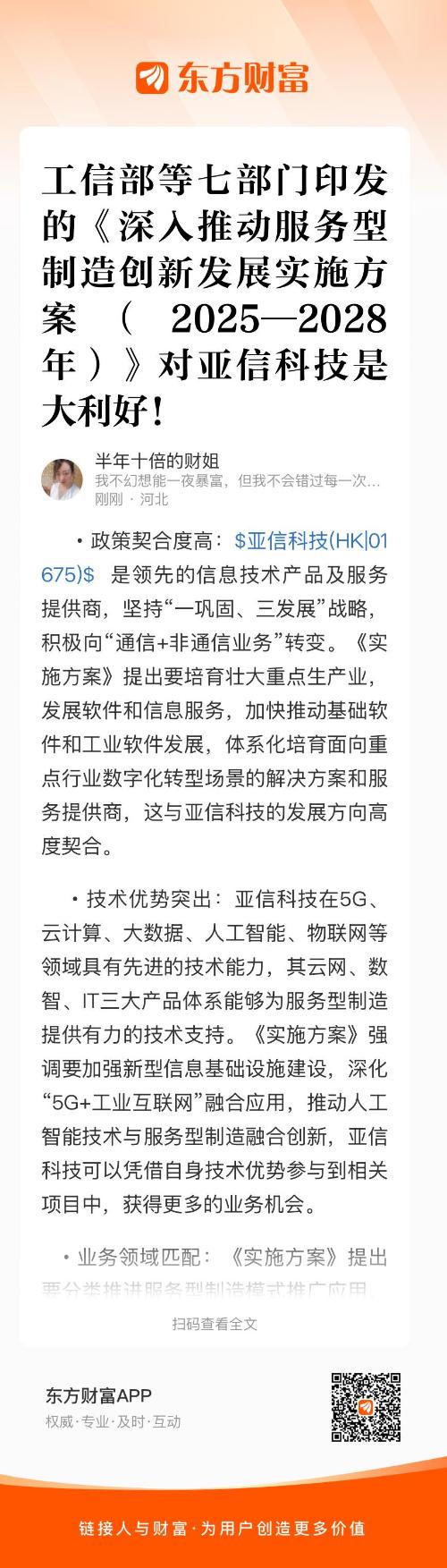 • 政策契合度高:$亚信科技(HK|01675)$  是领先的信息技术产品及服务提供商,坚持“一巩固、三发展”战略,积极向“通信+非通信业务”转变。《实施方案》提出要培育壮大重点生产业,发展软件和信息服务,加快推动基础软件和工业软件发展,体系化培育面向重点行业数字化转型场景的解决方案和服务提供商,这与亚信科技的发展方向高度契合。