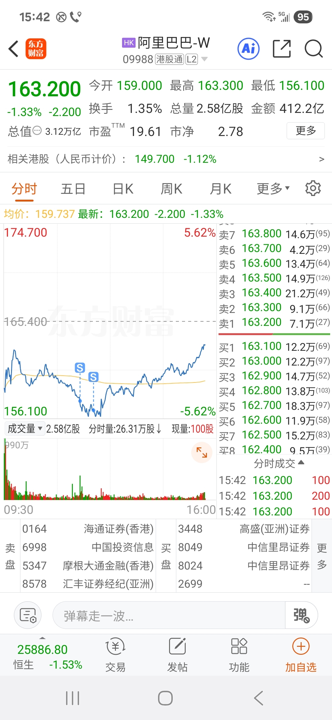 $阿里巴巴-W(HK|09988)$ 哎,清仓就拉了,不卖就继续跌,远离市场