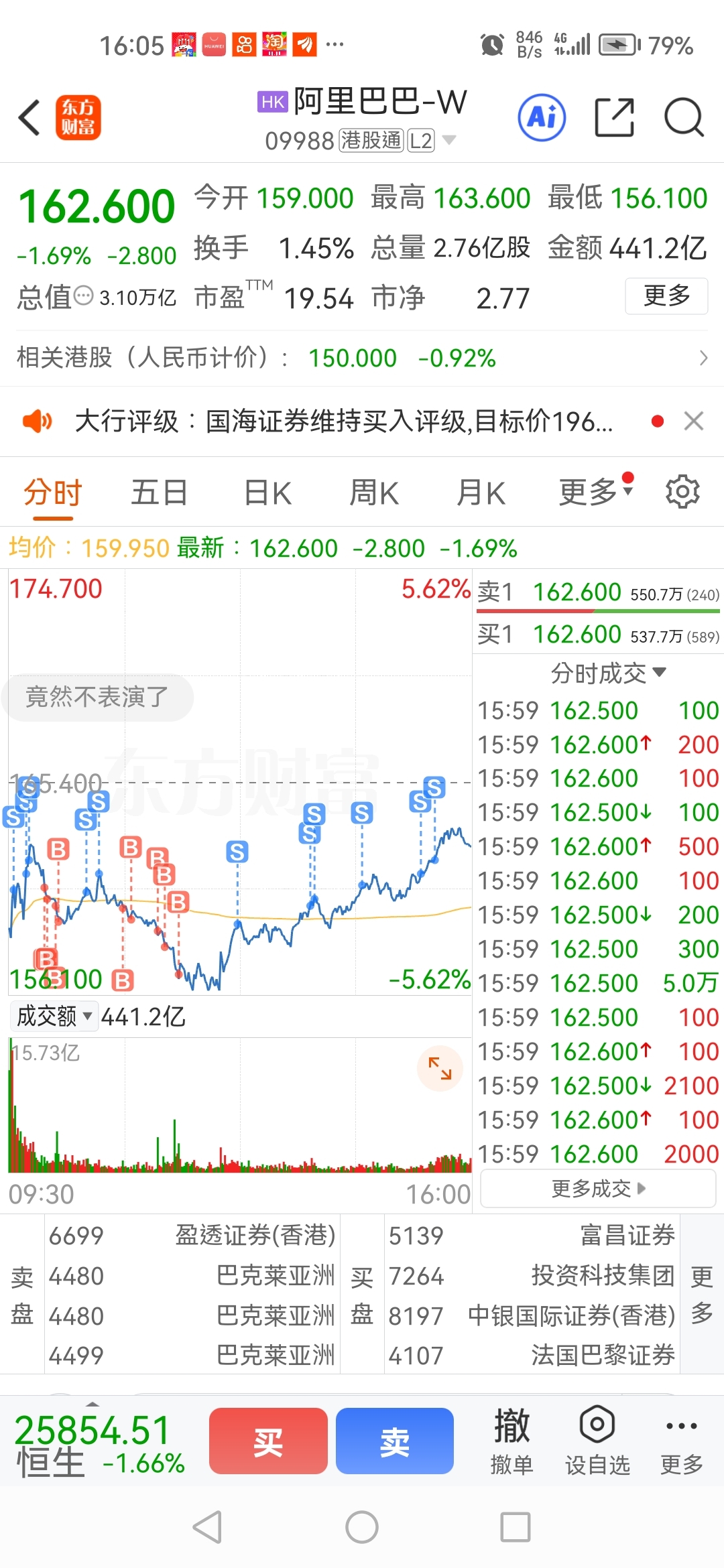 $阿里巴巴-W(HK|09988)$ 上午操作的。得心应手。下午操作的真恶心。下午不卖的话,收盘已经回本了。已清仓,亏900多块钱。