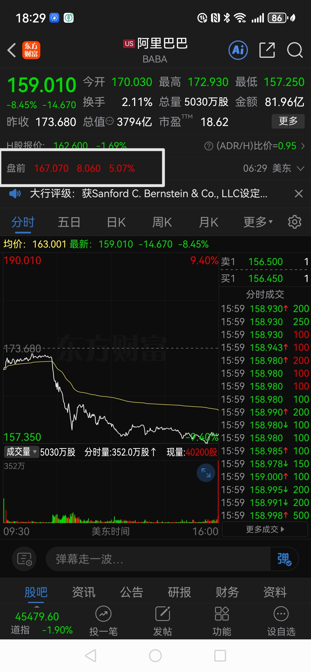 目前美股阿里巴巴涨5个多点啦,明天阿里巴巴-W稳了!