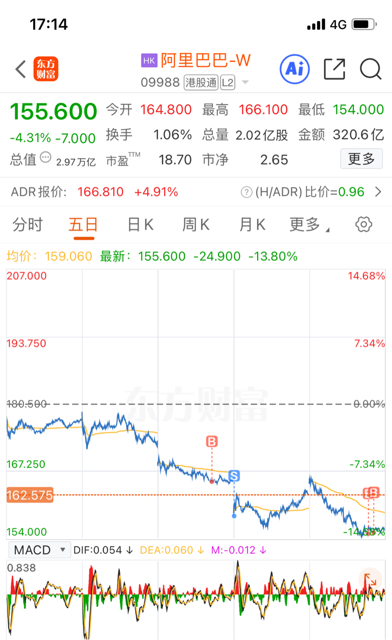 $阿里巴巴-W(HK|09988)$ 我又进来了,昨天还说金盆洗手140以下再来,但我觉得120是极限低位了,先把卖的买回来,真到120再买就是了,目前仓位11%,成本由165降到了162