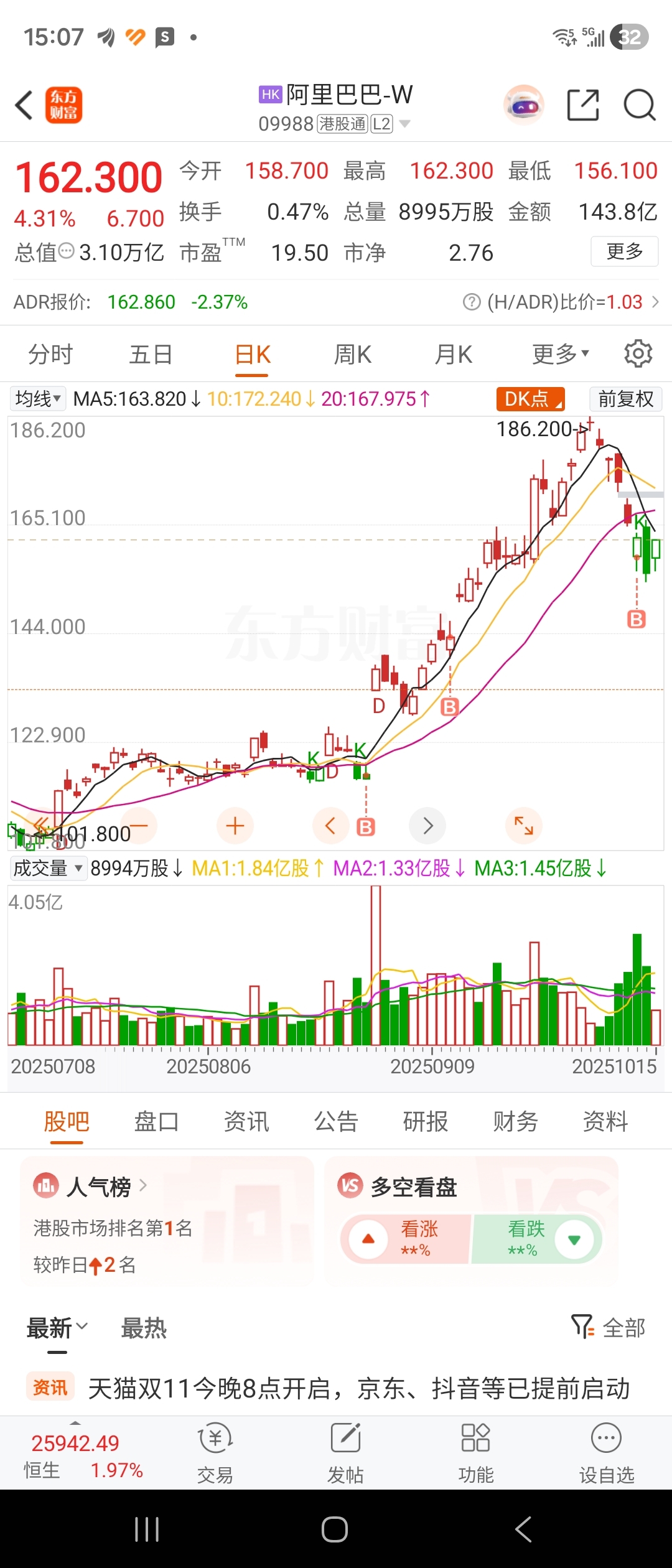 $阿里巴巴-W(HK|09988)$ 一股不卖,计划你的交易,交易你的计划。阿里一定会超越腾讯的市值。