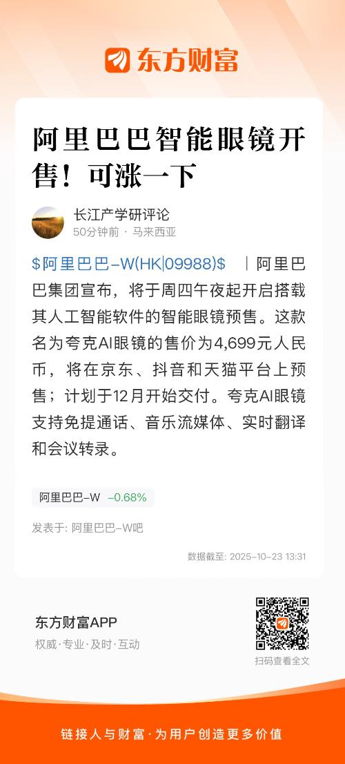 $阿里巴巴-W(HK|09988)$ |阿里巴巴集团宣布,将于周四午夜起开启搭载其人工智能软件的智能眼镜预售。这款名为夸克AI眼镜的售价为4,699元人民币,将在京东、抖音和天猫平台上预售;计划于12月开始交付。夸克AI眼镜支持免提通话、音乐流媒体、实时翻译和会议转录。