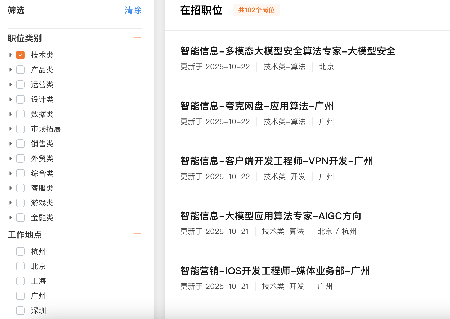 以旗下夸克为例,其招聘岗位不仅包括模型训练等基础技术,亦有不少岗位涉及学习、健康、创作等垂类场景。