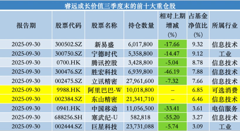 与此同时,阿里巴巴、东山精密新进睿远成长价值混合的前十大重仓股。
