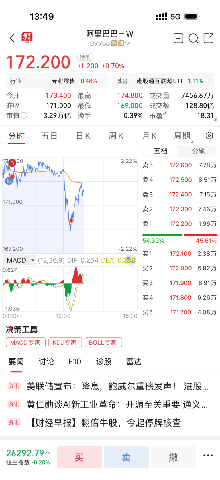 $阿里巴巴-W(HK|09988)$ 他跌咱就买点。
