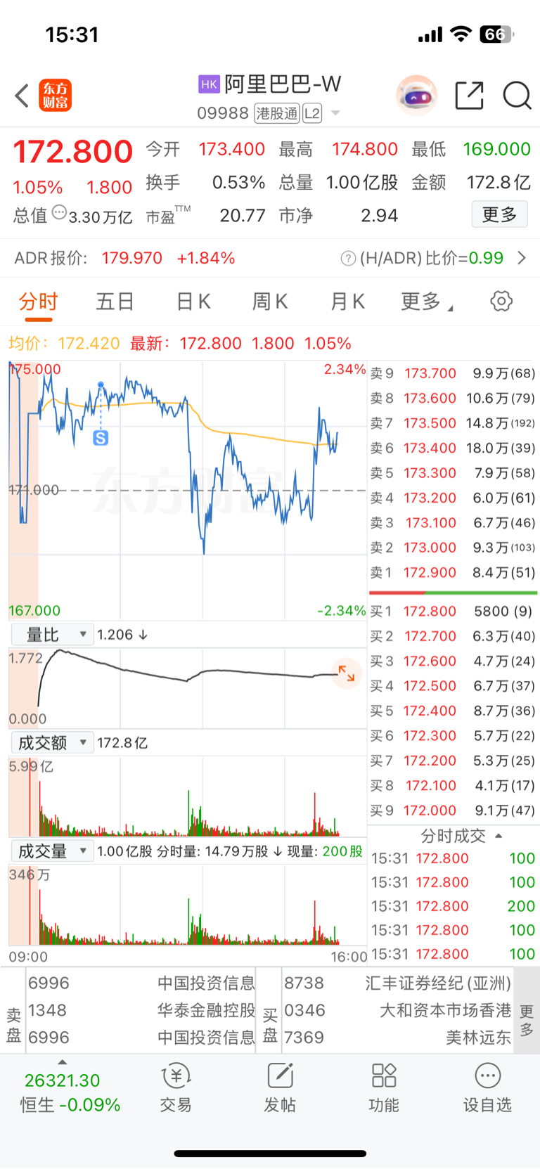 $阿里巴巴-W(HK|09988)$ 早盘卖了下午太累睡着了,忘了买回来,妈的!