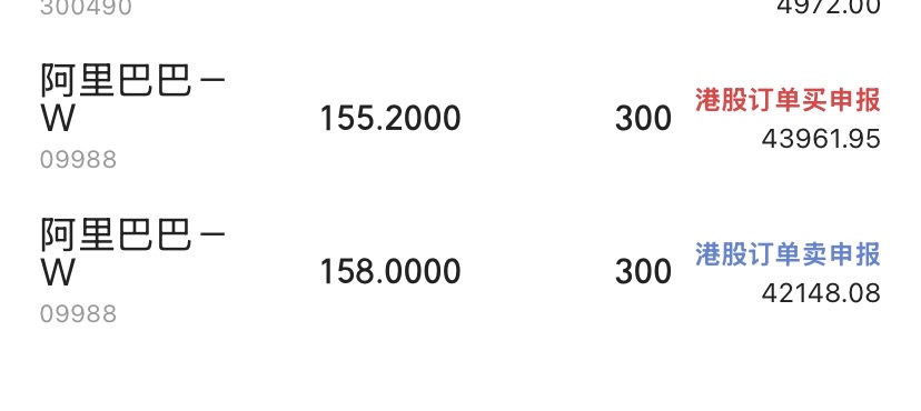 有没有人帮忙解释下我招商证券港股通早上155.2买的300股阿里巴巴花费4396