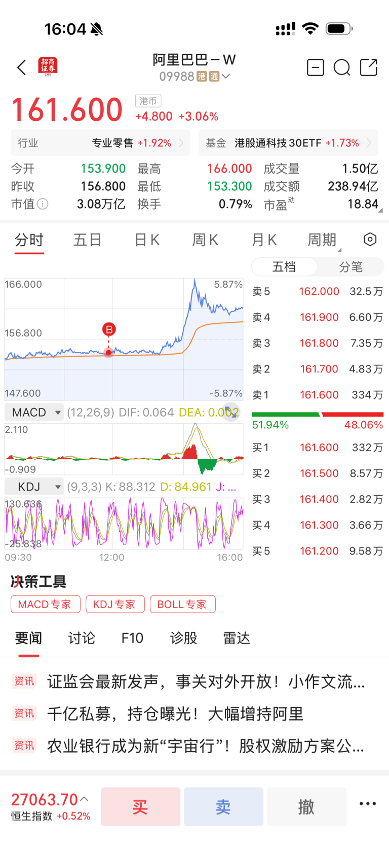 $阿里巴巴-W(HK|09988)$ 今天买完就准备不看了。没想到啊哈哈。逢低买点是个好习惯。