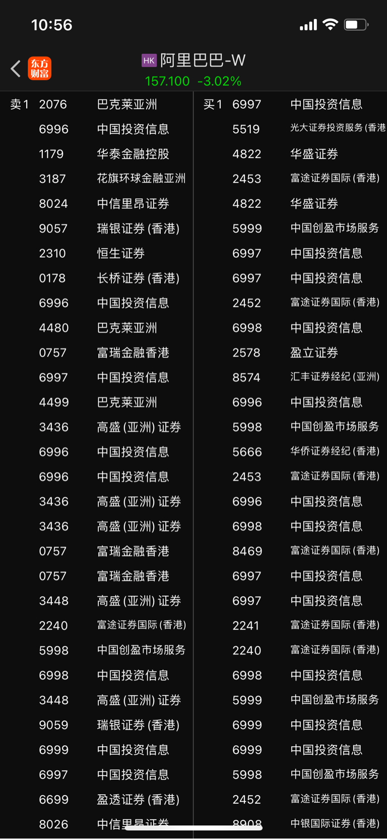 $阿里巴巴-W(HK|09988)$ 看下买盘和卖盘,买盘基本都是香港国内的机构,卖的大多都是国外机构。