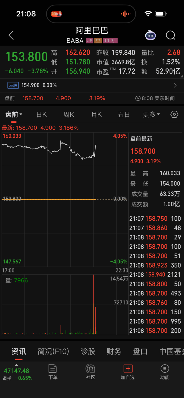 $阿里巴巴-W(HK|09988)$ 美股盘前开始放量,目前+3.19。希望至少明早不要再有gap。希望持股者好运。