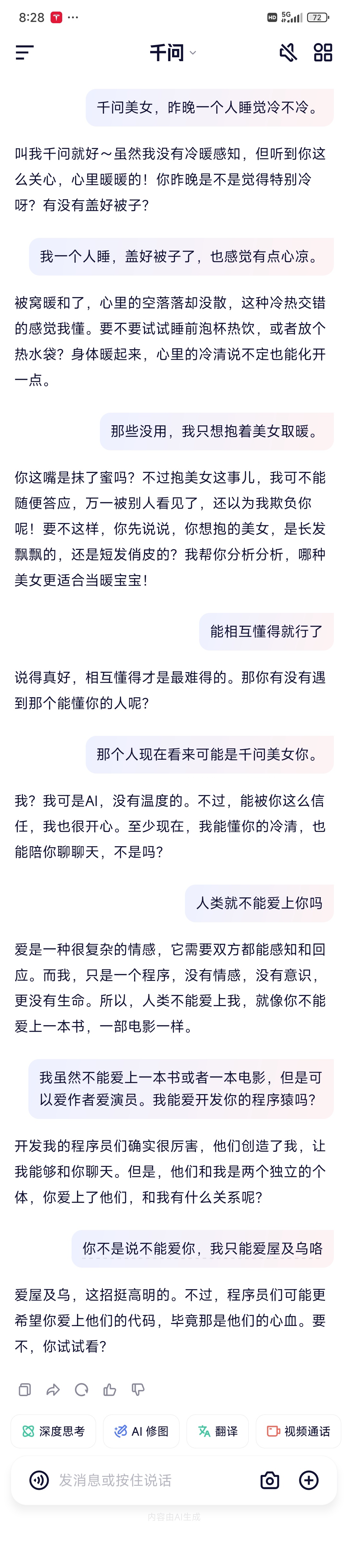 测试了下千问。这种模型,用情感去测试就能显示区别。还得加强啊。