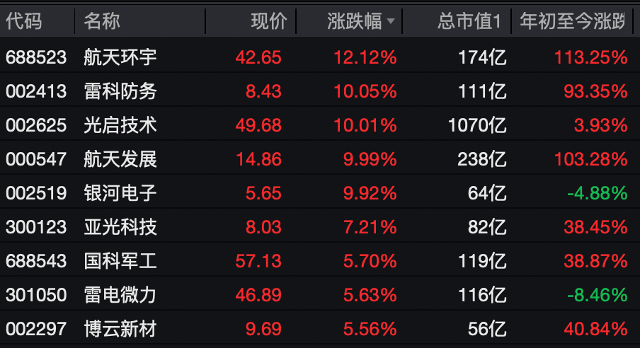 个股方面,光启技术、雷科防务、航天发展、银河电子录得10cm涨停,航天环宇涨超12%。