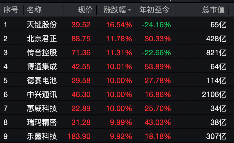个股掀“涨停潮”。其中,贝隆精密录得20cm涨停,美格智能、福蓉科技、德赛电池、道明光学、博通集成、惠威科技、瑞玛精密纷纷涨停。