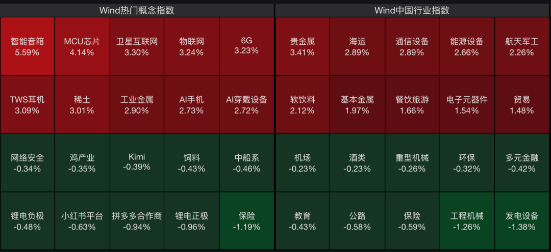 从板块看,消费电子板块领涨,有色金属、餐饮旅游、航天航空板块涨幅居前,而保险、发电设备等板块走弱。