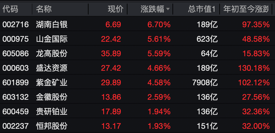 个股方面,湖南白银涨6.7%,山金国际涨5.61%,龙高股份、盛达资源、紫金矿业、金徽股份、贵研铂业、湖南黄金、中金黄金等跟涨。