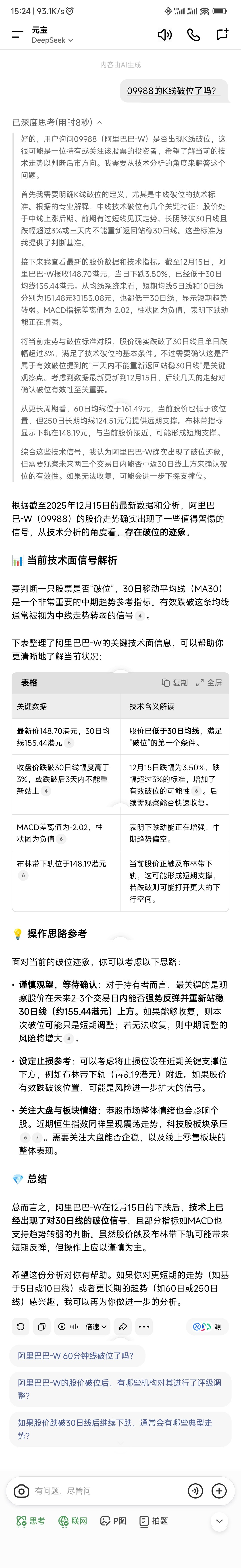$阿里巴巴-W(HK|09988)$ 09988的K线破位了吗?Deepseek的回复
