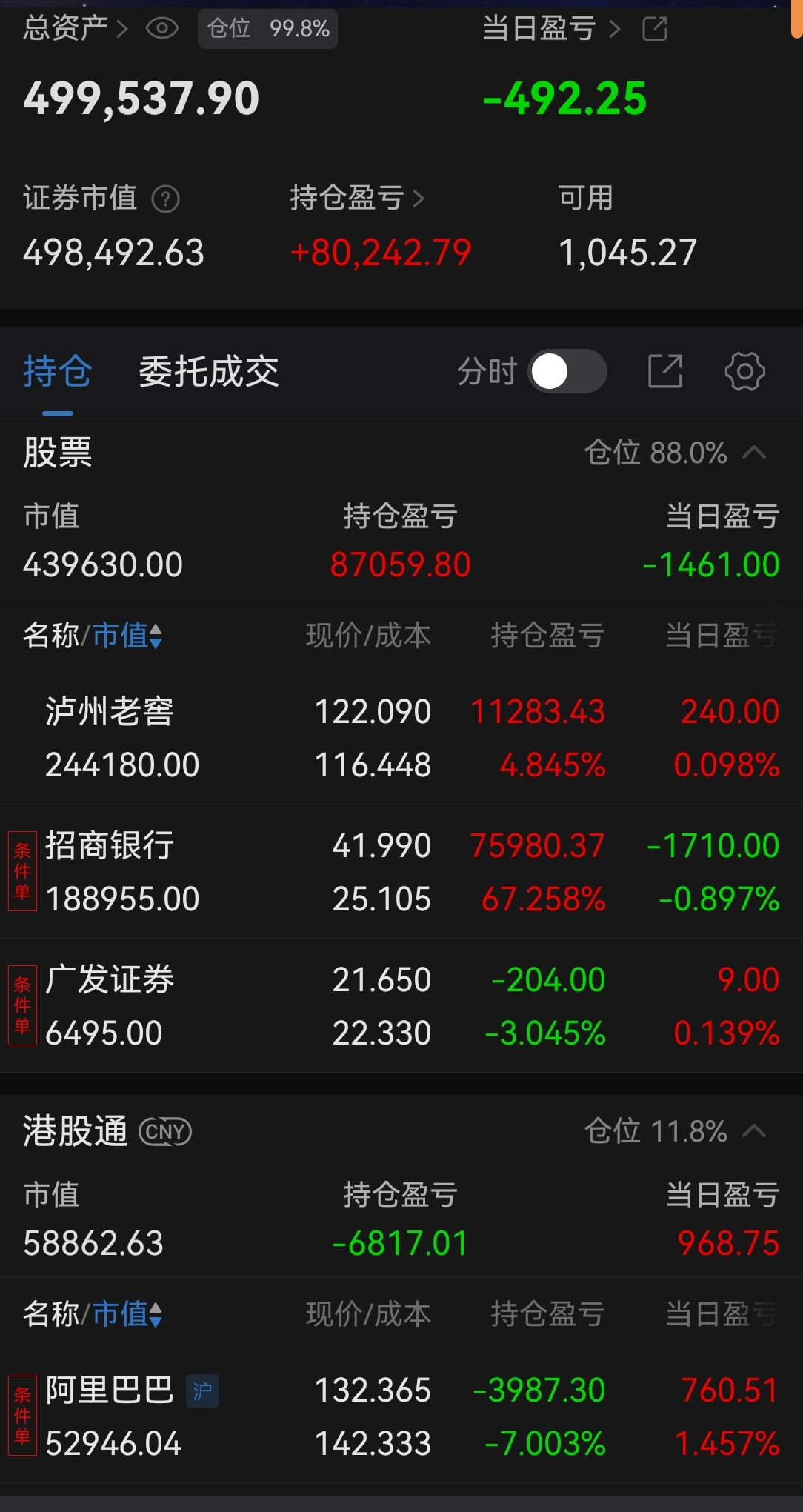 今天浮亏约500元,无操作。昨天招行涨,今天它就跌,昨天阿里跌,今天它又涨,涨跌