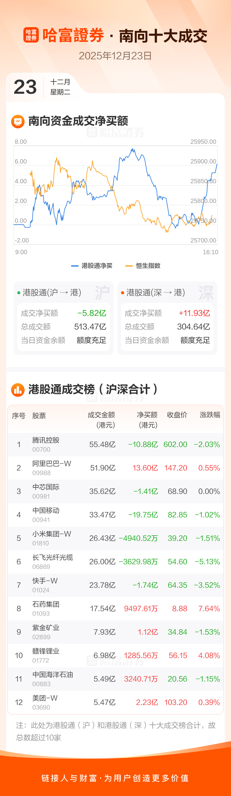 恒生指数12月23日跌0.11%,收报25774.14点。南向资金今日净买入港股6.11亿港元。南向资金今日成交额818.11亿港元,港股大市成交1571.31亿港元。