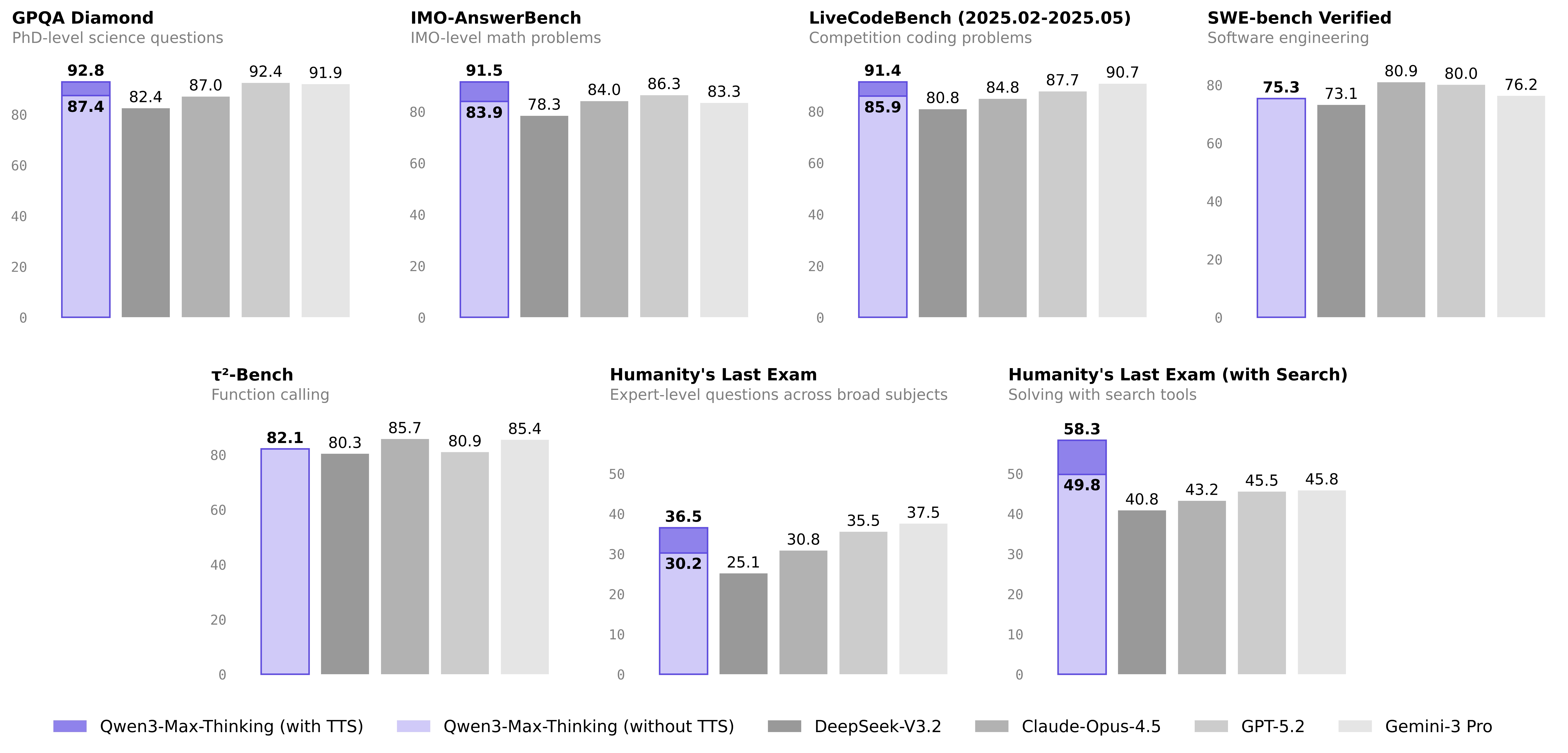 在多项关键性能基准测试中,千问表现超过了GPT-5.2、Claude Opus 4.5和Gemini 3 Pro等顶尖模型,刷新科学知识(GPQA Diamond)、数学推理(IMO-AnswerBench)、代码编程(LiveCodeBench)等多项关键性能基准测试的全球纪录。
