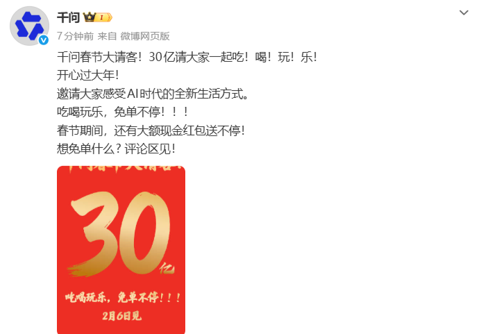 【大河财立方消息】2月2日,千问App宣布投入30亿启动春节攻势,全面接入淘宝闪购、大麦、飞猪、盒马等阿里生态业务,该计划将于2月6日上线。
