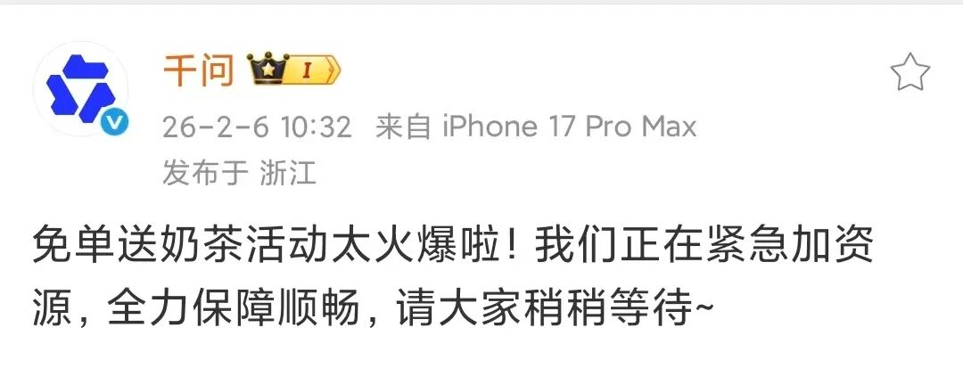 对此,千问表示,免单送奶茶活动太火爆,正在紧急加资源,全力保障顺畅,请大家稍稍等待。
