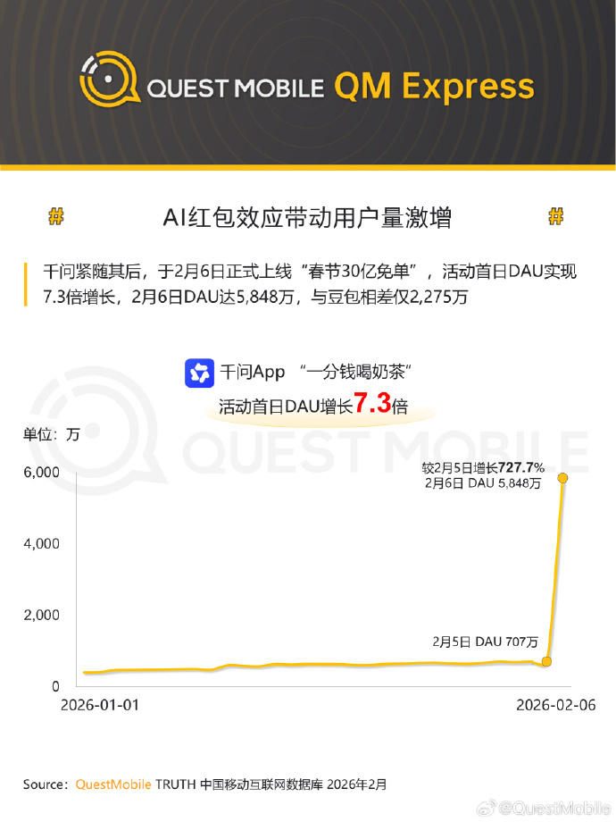 2月10日,QuestMobile发布最新数据,在新春活动启动首日(2月6日),千问App的日活跃用户(DAU)实现了727.7%的增长,达到5848万,比前一天多出超5100万。