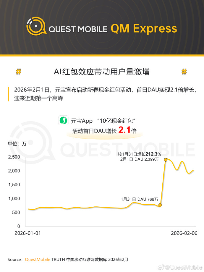 不过,从元宝App后续的DAU走势来看,“红包大战”的“首日效应”极其显著:红包一旦发放,用户蜂拥而至;红包热度消退,DAU便开始回落,2月6日,元宝App的DAU降至2000万左右。