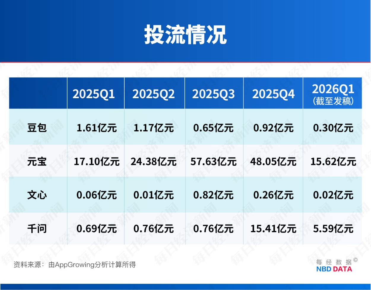 2025年第四季度,千问App“空降”月活榜单第五,月活用户规模达2571.9万,仍落后元宝整整1500万。从投流数据来看,千问App在当季的投流金额从前三季度的不足1亿元飙升至15.41亿元,增幅近20倍。
