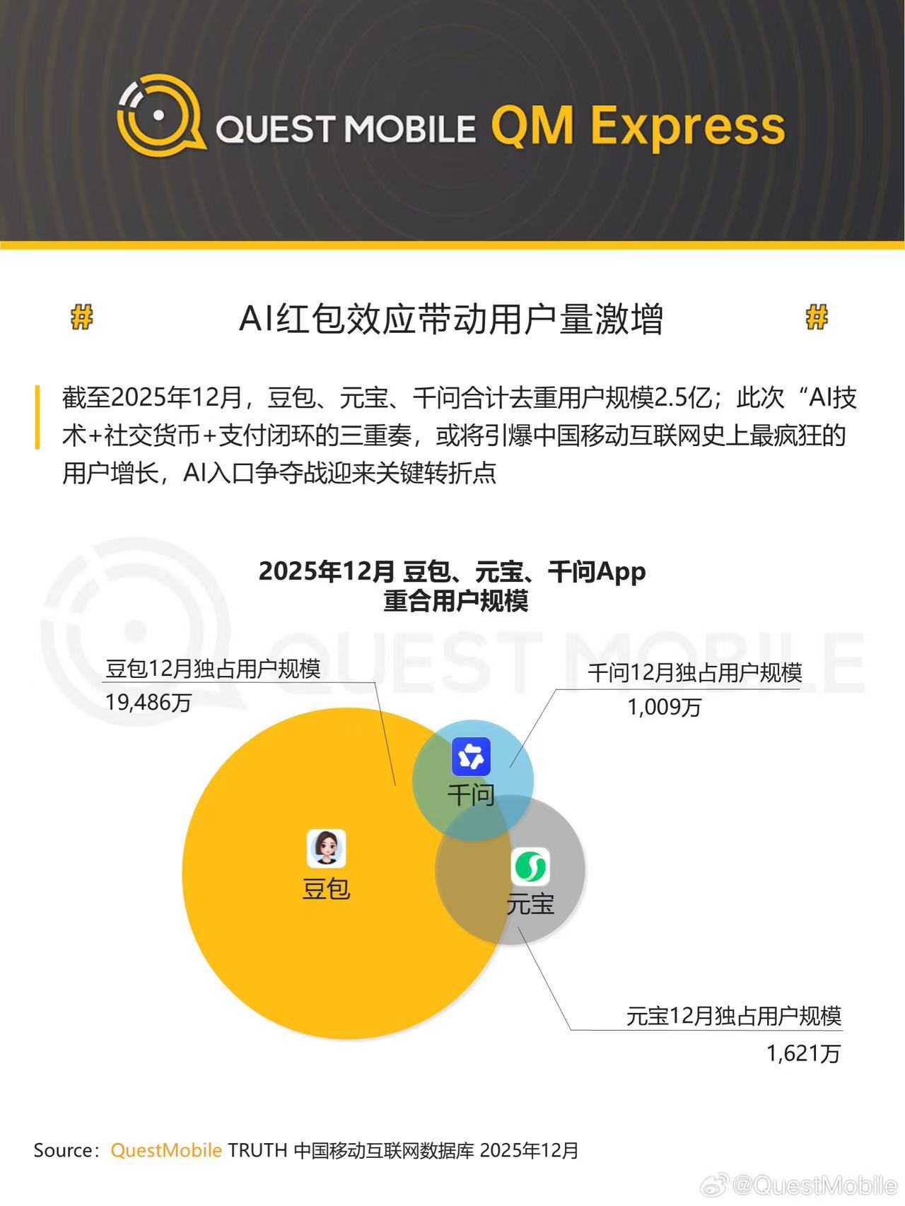 QuestMobile称,此次“AI技术+社交货币+支付闭环”的三重奏,或将引爆中国移动互联网史上最疯狂的用户增长,AI入口争夺战迎来关键转折点。