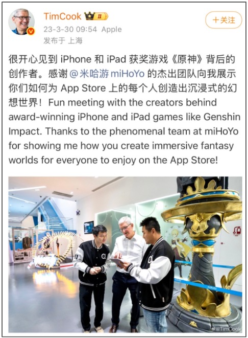 2023年3月,在参加中国发展高层论坛期间,库克访问了米哈游。这不仅因为《原神》是全球商业现象级游戏,更在于它是苹果生态内一块有效的“试金石”。
