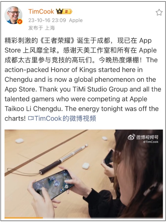 当然,这种姿态也延续到了大众化的游戏场景中。2023年10月,他在人头攒动的成都太古里Apple Store,兴致勃勃地观看了《王者荣耀》表演赛,在年轻玩家的欢呼声中,感受着这款国民级应用的热度。