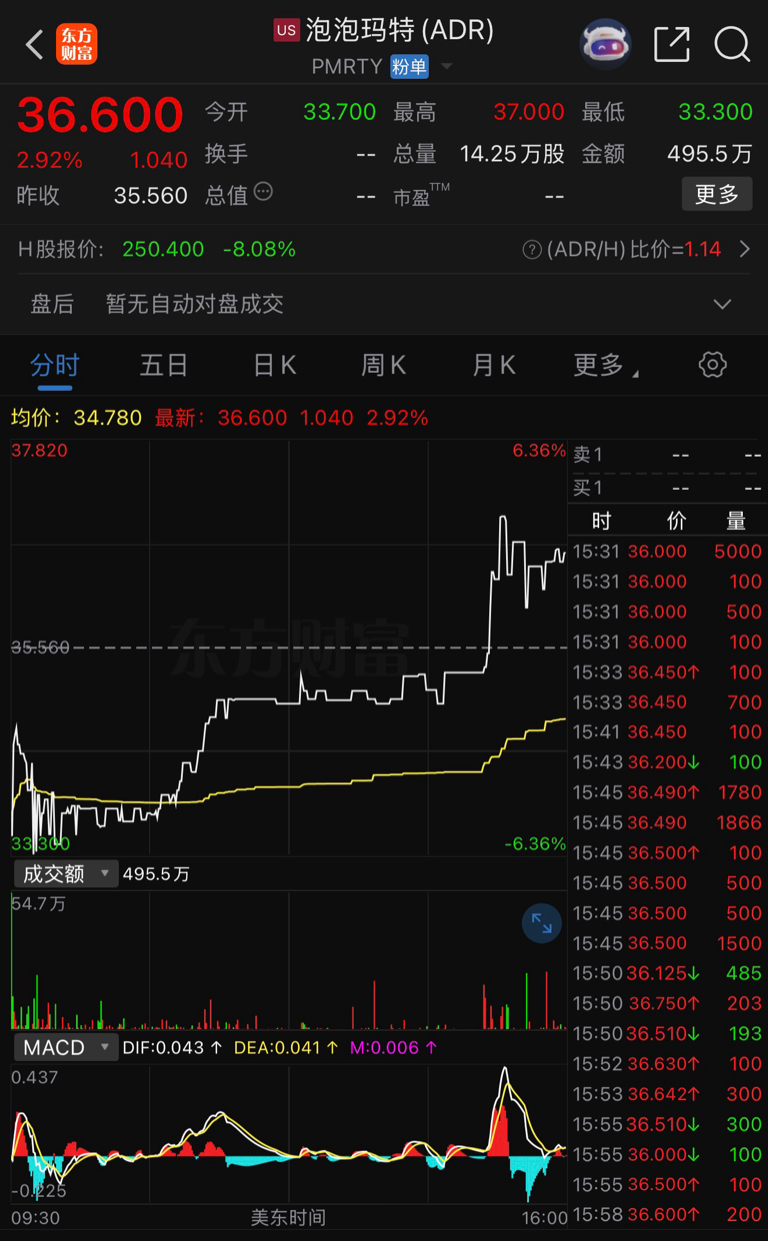 泡泡玛特(ADR/H)比价=1.14,是什么意思