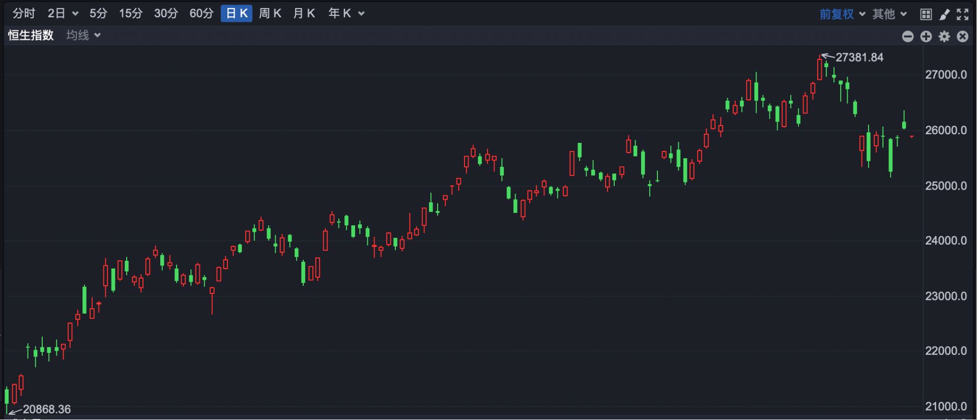 截至发稿,恒生指数报25897点,下跌129.93点,跌幅0.50%。