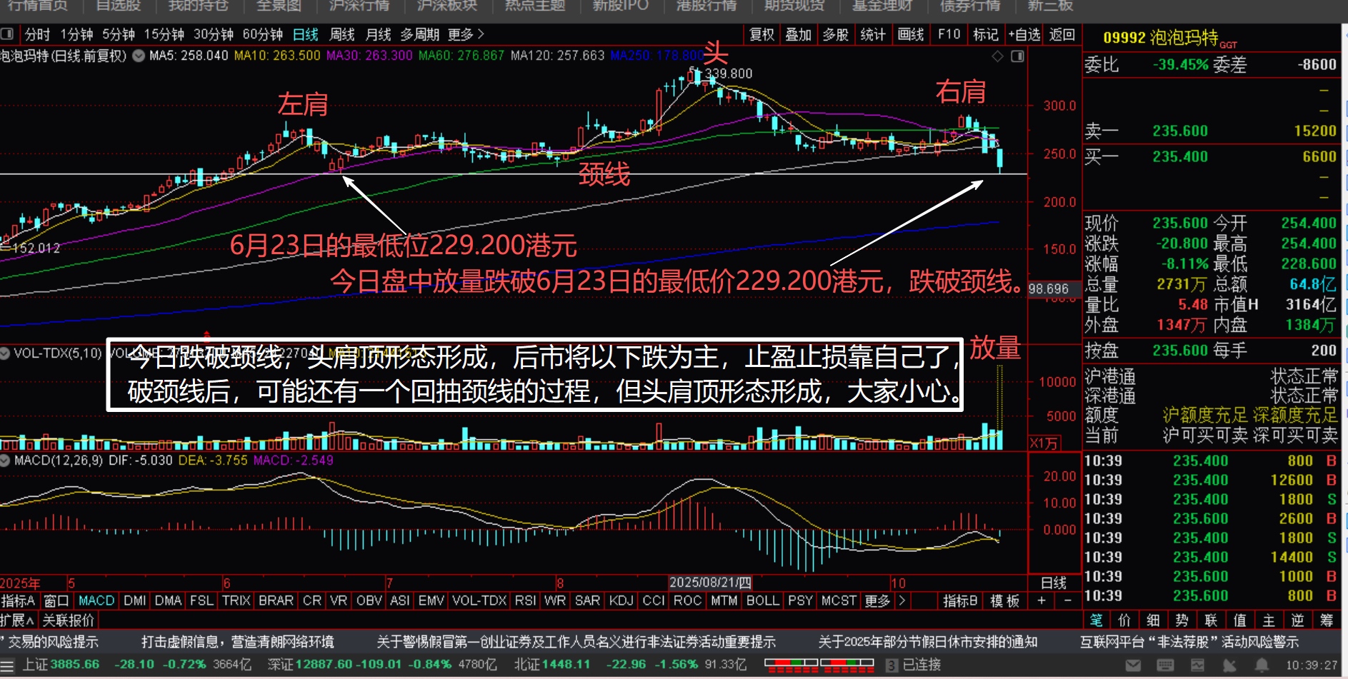 $泡泡玛特(HK|09992)$ 小心了,放量跌破颈线了。