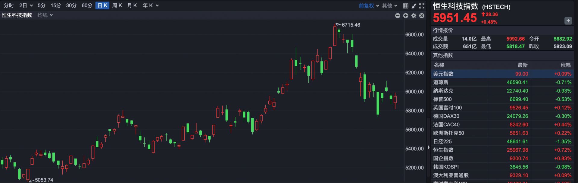 恒生科技指数报收于5951.45点,上涨28.36点,涨幅0.48%。