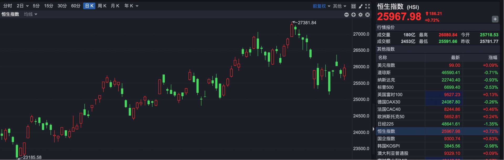 截至收盘,恒指报收于25967.98点,上涨186.21点,涨幅0.72%。