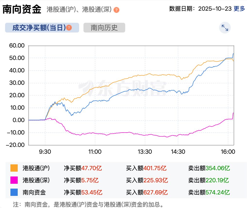资金方面,今日南向资金继续净买入港股通标的。截至收盘,南向资金净买入港股金额超53亿港元。